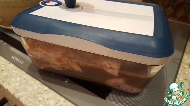 У меня ёмкость со специальным клапаном. Я выкачиваю блендером воздух и продукты маринуются быстрее и эффективнее.