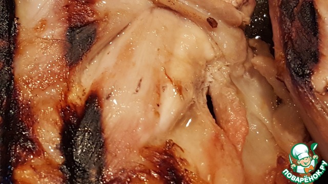 Открываем. Накалываем окорочок вилкой. Ждём сок. Если сок вытекает прозрачный, то окорочка готовы. Если красный, закройте гриль и жарьте ещё до 5 минут.