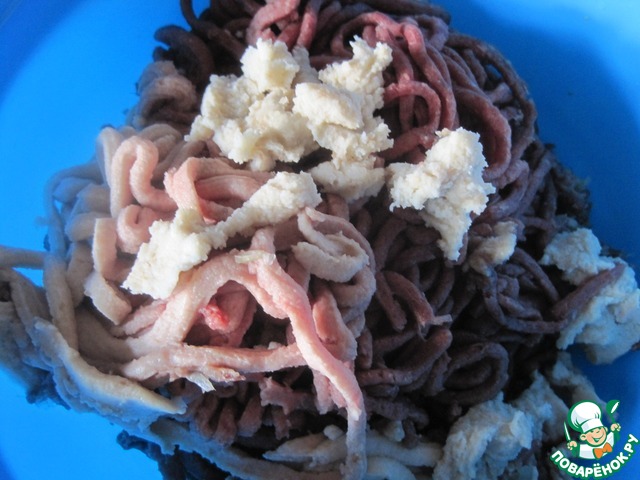 • Готовим начинку. Мясо с луком и замоченным хлебом пропускаем через мясорубку, перемешиваем.
