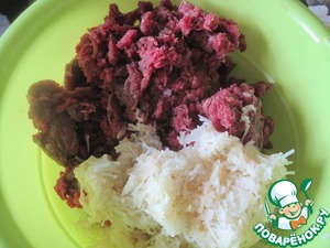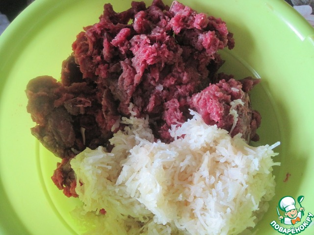 Говядину с луком и сердцевиной 3-4 картофелин пропускаем через мясорубку, солим.