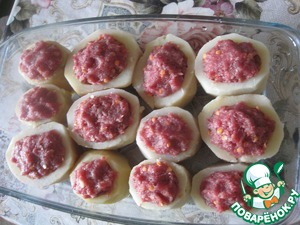 Соус томатный смешиваем с водой и заливаем фаршированный картофель.