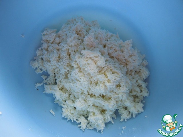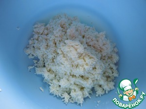 К протертому творогу добавить яйца, соль и сахар. Хорошо перемешать.