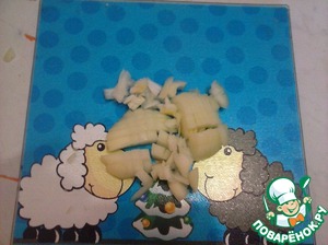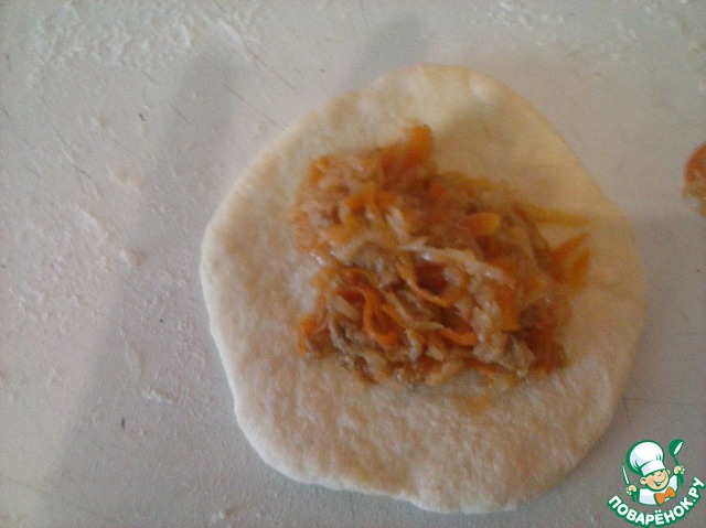 Отрезаем небольшое количество теста, раскатываем лепешку, укладываем небольшое количество начинки, лепим пирожок.