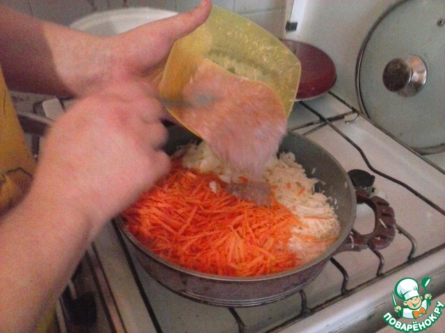- Масло растительное (3 ст.л. в начинку, остальное для жарки) — 2 стак.