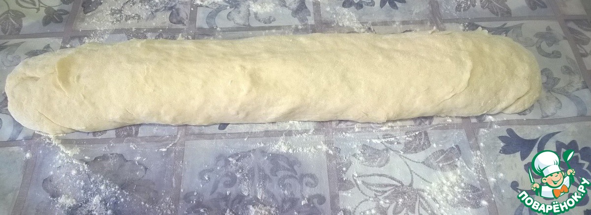... выкладываем его на стол, слегка обваливаем в муке и формируем "колбаску". Одновременно - разогреваем духовку - до максимума (если нет термодатчика) или до 220-230 градусов.