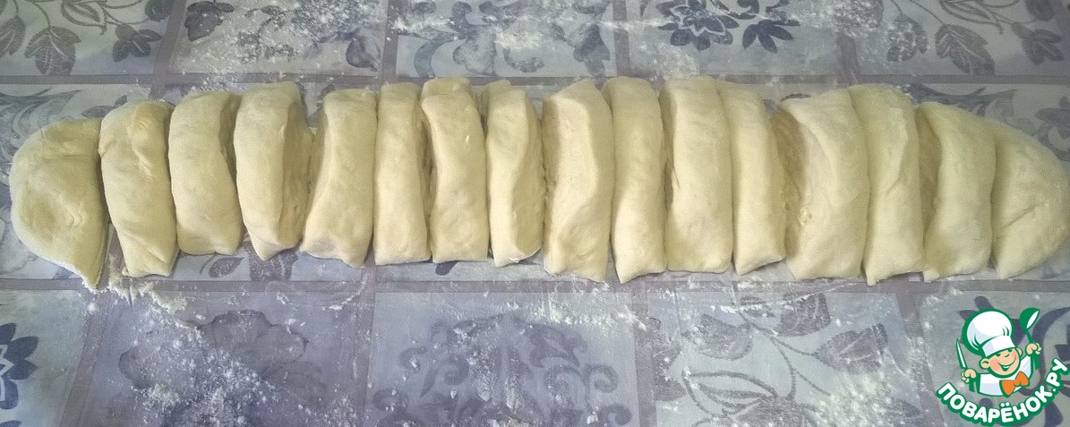 Делим тесто на 16 равных частей ножом. Каждую часть скатываем в колобок и накрываем (полотенцем, пленкой или крышкой - если есть достаточно большая форма), чтобы поверхность теста не сохла.