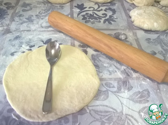 Раскатываем лепешки непосредственно перед выпеканием. Я размещала по 3 лепешки на решетку духовки за раз. Соответственно - раскатывала по 3 лепешки. Толщина - около полу-сантиметра. Для наглядности на фото поверх лепешки - обычная чайная ложка.