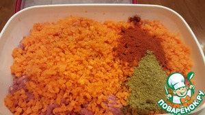 У меня было филе бедра индейки. Помыть мясо и почистить морковь. Провернуть в мясорубке мясо и морковь. Если у Вас готовый фарш, можно натереть морковь на крупной тёрке.