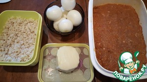 Отварить рис. Остудить. Почистить лук. Подготовить сыр и достать из холодильника фарш.