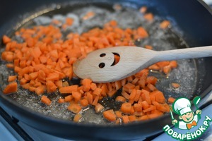 На сковороде растопить масло. Морковь мелко нарезать на кусочки и обжарить на масле. Прикрыть крышкой, притушить 5 минут.