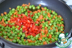 Добавить мелко нарезаный красный перец, зеленый горошек, под конец, мелко нарезаный чеснок. Посолить, поперчить. Снять с огня.
