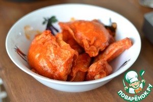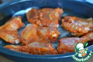 Смешаем подсолнечное масло, перец, соль и куркуму. Натрем смесью куриные части. Отставим минимально на 2 часа. У меня стояли ночь.