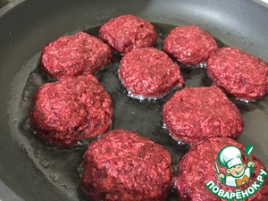 Формируем котлетки и выкладываем на разогретую сковороду с подсолнечным маслом. Жарим. С каждой стороны минуты 2 - 3 на среднем огне.