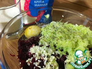 В миску со свеклой добавляем измельченный чеснок, специи, соль, сахар и яйцо. Туда же натираем кабачок. Перемешиваем. Если свекла очень сладкая - сахар не нужен.