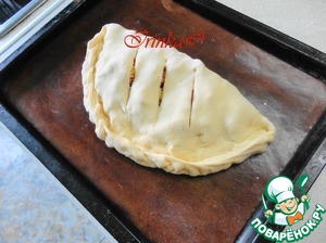 Начинку хорошо прижимаем, накрываем второй половиной теста и тщательно защипываем косичкой, чтобы соус не вытек и весь остался внутри.