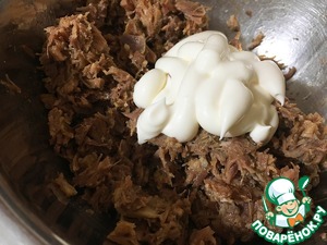 Мясо я мелко нарезала. Солить не стала, так как мой гуляш был достаточно соленым. Добавила майонез. -