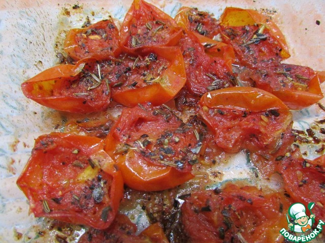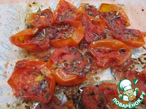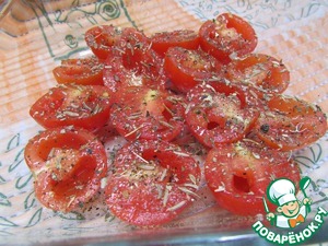 Подготовленные помидоры выложить в форму, посолить, поперчить и посыпать прованскими травами. Сбрызнуть оливковым маслом и отправить в микроволновку. Мощность СВЧ - 750, время - 3 минуты. Затем открыть СВЧ, чтобы вышла вся влага. Повторить 2-3 раза.