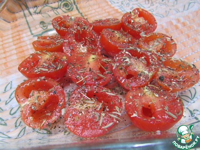 Вяленые помидоры можно купить в магазине. Но я приготовила их сама. Помидоры черри помыть, обсушить и разрезать на две половинки. Маленькой ложечкой вынуть семечки.