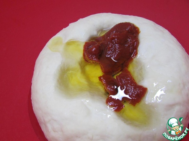 Добавить оливковое масло и томатную пасту. Вымесить тесто.