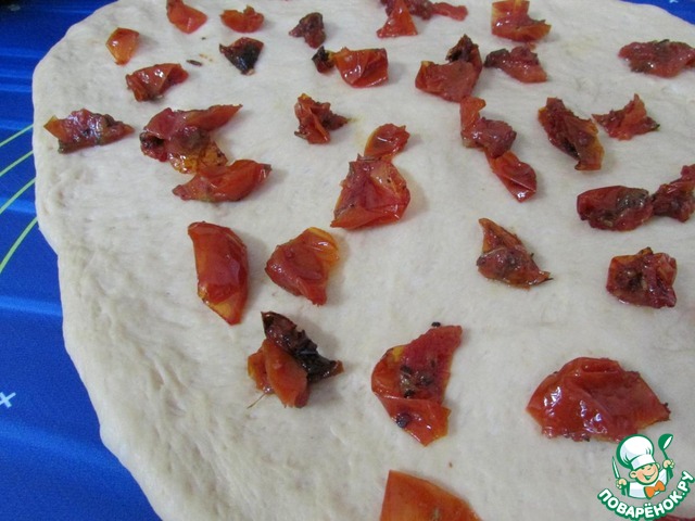 Вяленые помидоры порезать на кусочки и выложить на тесто.