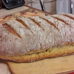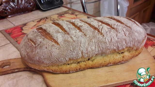 Переложить батон на противень. Ножом сделать насечки. Накрыть салфеткой и дать 20 минут на расстойку. Затем отправить в разогретую духовку (200 градусов), выпекать 35-40 минут. Готовность проверить деревянной шпажкой.