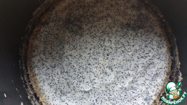 Достать и разрезать на 2 коржа. Бисквит можно испечь и в духовке при t 180 градусов в течение 30 - 40 минут. По структуре бисквит очень легкий, практически невесомый с приятной маковой хрустинкой. Каждый корж с внутренней стороны надо промазать лимонным курдом. Его можно приготовить самостоятельно /на сайте много рецептов/, или использовать для прослойки Ваш любимый джем.