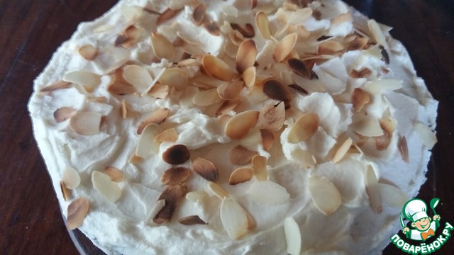 Собираем торт. Половину крема наносим на нижний корж, оставшимся покрываем весь торт. Верх я сделала волнистым и украсила обжаренными миндальными лепестками.