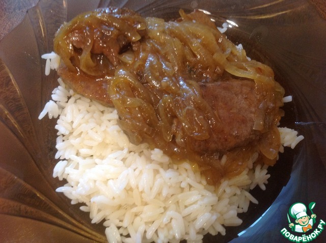 Печень выкладываем аккуратно на разогретую сковородку с подсолнечным маслом, по пару минут обжариваем с каждой стороны, добавляем лук, жарим еще пару минут (все на средне-большом огне). Добавляем соус (можно еще 50-100 мл кипяточка) и на медленном огне томим минут 5-7. Выключаем, даем настояться и наслаждаемся.