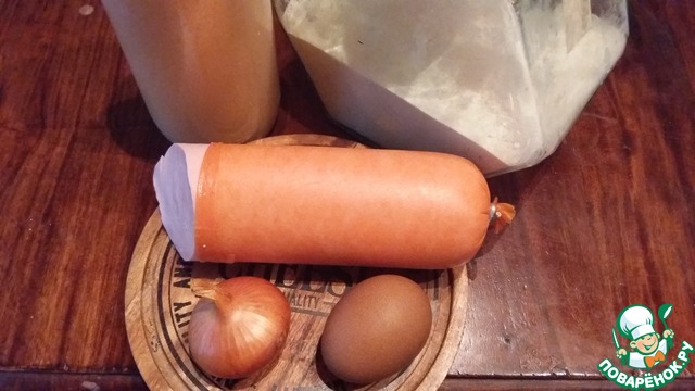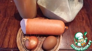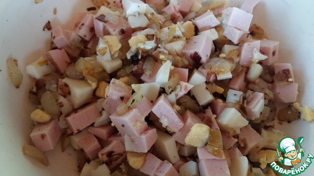 Для начинки обжариваем на растительном масле мелко нарезанную луковицу /не забыть ее посолить и поперчить/ и смешиваем ее с мелко нарезанным варенным яйцом и докторской колбасой.