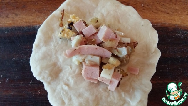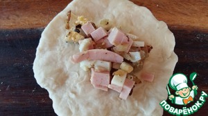 От теста отщипнуть кусочек, растянуть его руками и выложить начинку.