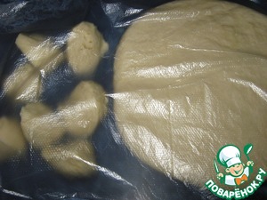 Тесту дать согреться. Поделить на меньшую и бОльшую части. Большую часть раскатать в пласт - это основа пирога.