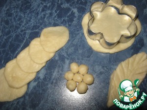 Из меньшей лепить цветы - можно вырезать формочкой или просто слепить из шариков и листья - делая ножом прожилки. Для розочек раскатать маленькие кружочки, выложить их друг на друга внахлёст.