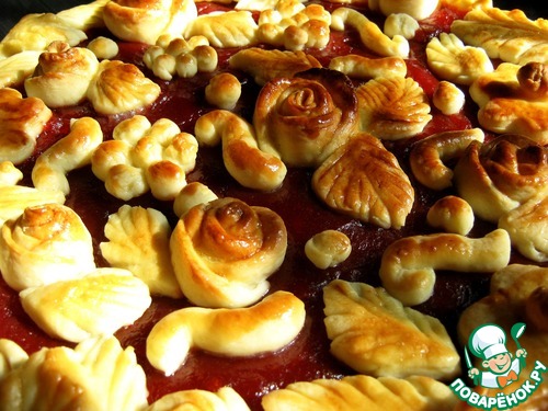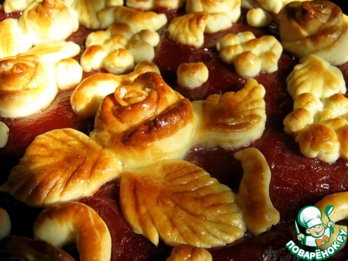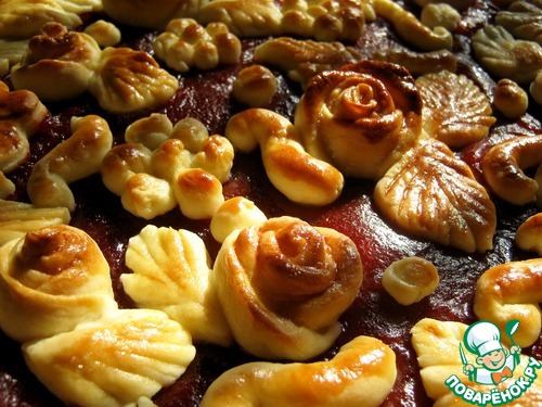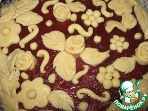 Покрыть слоем повидла. И выложить цветы и листочки.