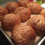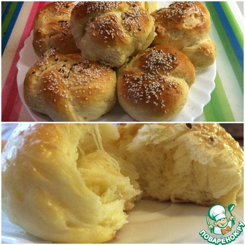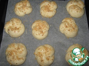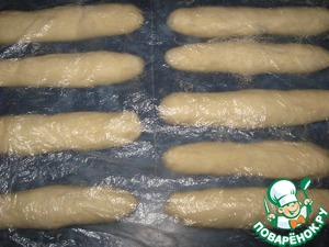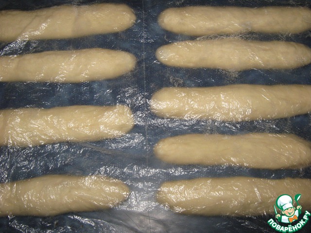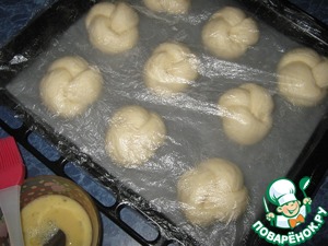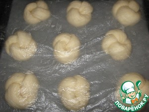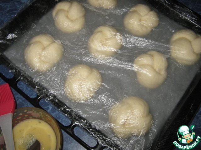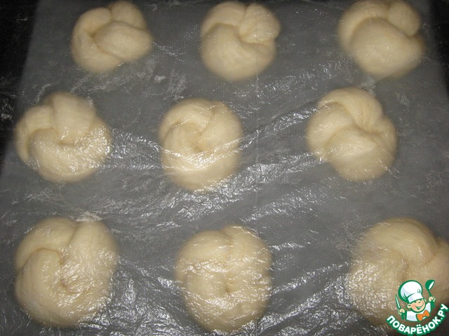 Застелить пергаментом противень. Булочки выложить и накрыть плёнкой. Расстоять 20-25 минут.
