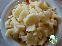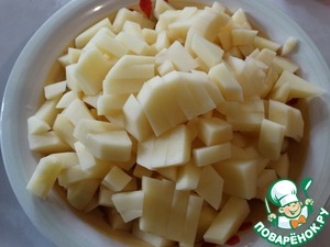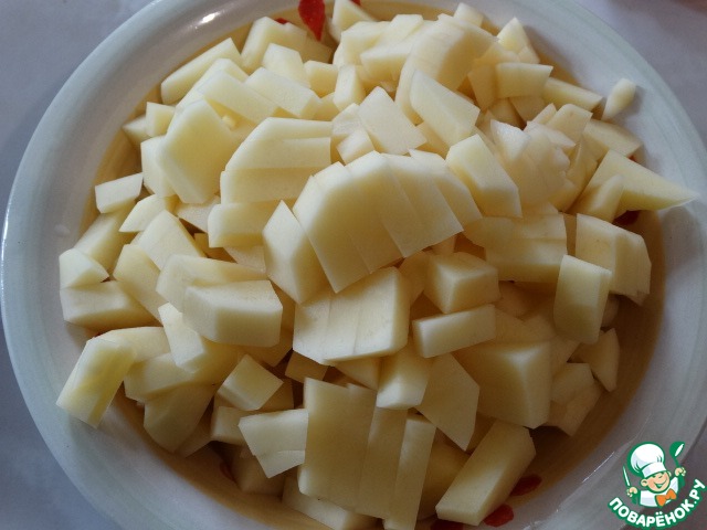 Бульон процедим, чтобы быть уверенными в отсутствии мелких осколков костей, и доведем до кипения. В кипящий бульон опустим очищенный и нарезанный брусочками картофель; дождавшись закипания, огонь убавляем.