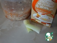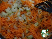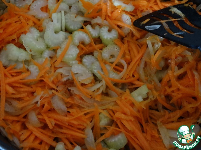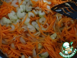 На растительном масле обжарим лук с морковью и сельдереем. Лук нарезан вдоль, морковь натерта на крупной терке, а сельдерей тонкими кусочками поперек.