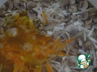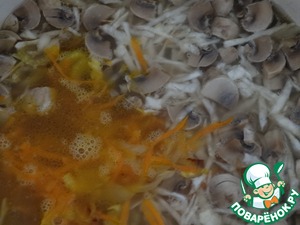 Когда картофель в бульоне сварится до полуготовности, добавляем квашеную капусту и нарезанные свежие или замороженные грибы, продолжаем варить до готовности картофеля.