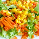 • Листья салата промыть, просушить, нарвать руками и сложить в салатник к моркови с кукурузой. Салат можно использовать любой, какой вы больше предпочитаете.