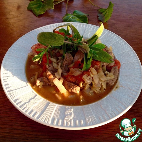 • Выложить на лук куски птицы, приправить базиликом, мятой, корнями петрушки. Посолить.