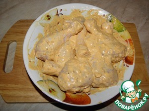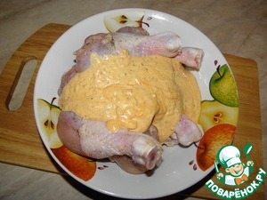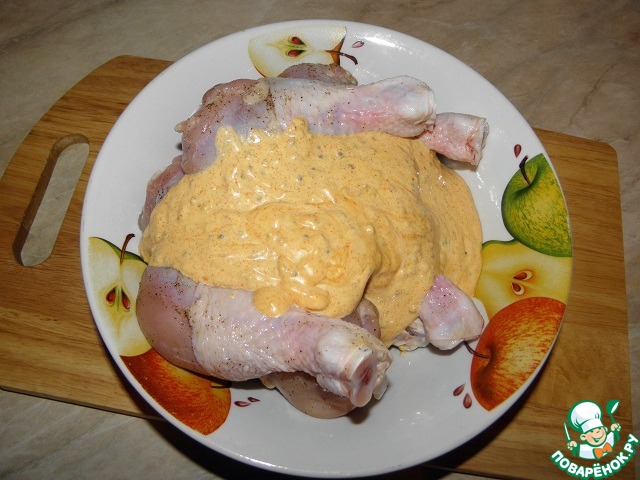 Курицу (если целая курица, разрезать на 4 части), если голени, бедра- оставить, как есть. Посолить, поперчить, добавить соус-маринад.