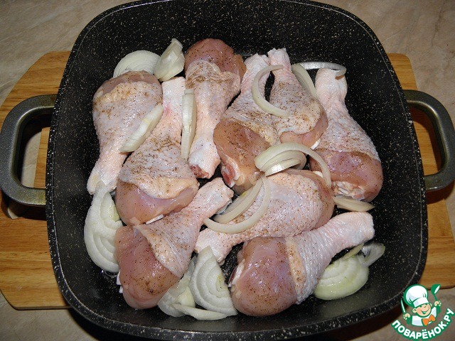 Если целая курица, разрезать на порционные куски, у меня были голени. Посолить, поперчить, выложить в глубокую сковороду, добавить немного воды, положить лук, и поставить на слабый огоньтушить