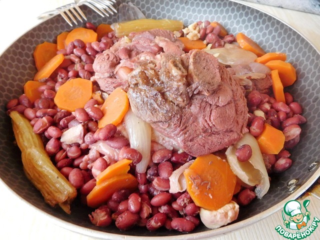 Фасоль, морковь, сельдерей и лук шумовкой выложить по краям мяса;