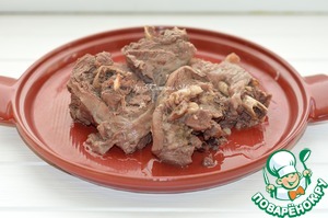 Готовое мясо шумовкой выложить на середину жаропрочного блюда;