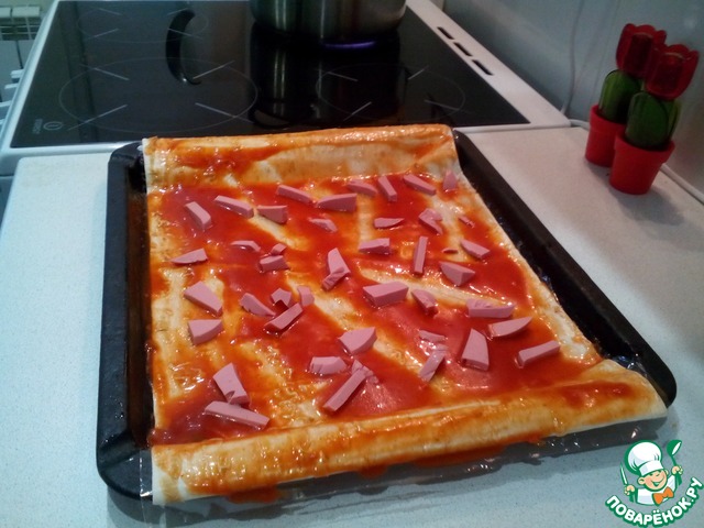 Для приготовления нам понадобится противень, на него расстилаем разрезанный "рукав", смазываем подсолнечным маслом, кладем лаваш-ролл, смазываем кетчупом с майонезом, выкладываем тонко порезанные помидорки и колбасу, порезанную соломкой=>