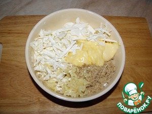 Добавить сливочное масло (мягкое, комнатной температуры), плавленый сырок, майонез, чеснок (через чесночницу)