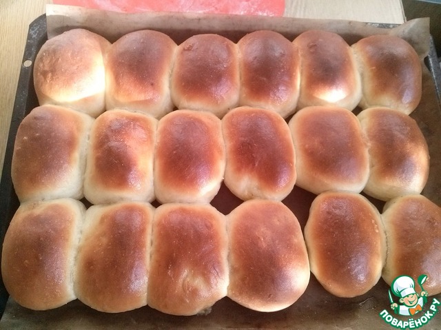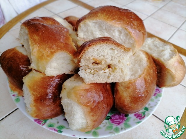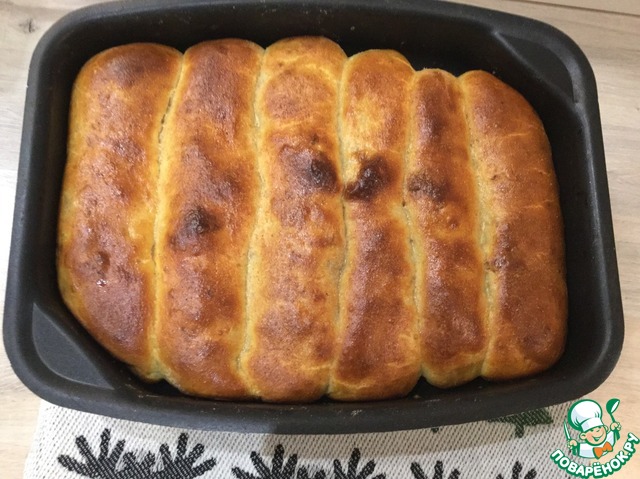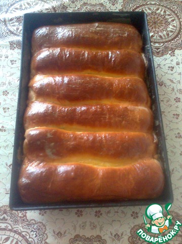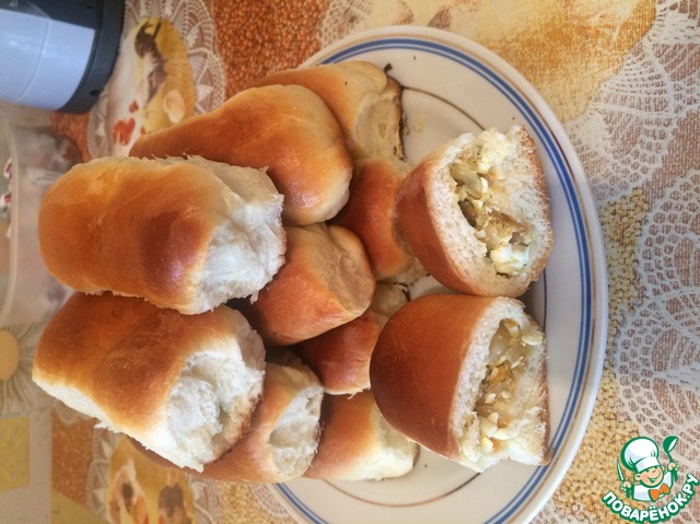 В мою прямоугольную форму поместилось семь рулетиков. Укладывать не плотно. Дать пирогам расстройку минут 30, смазать яйцом и выпекать при температуре 200 градусов до румяности.