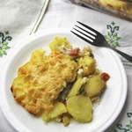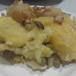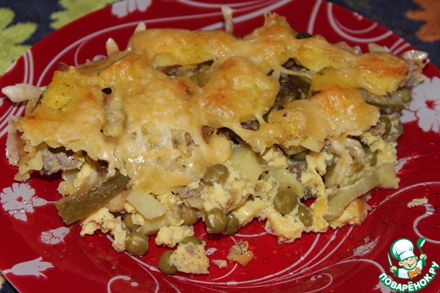Запечённый картофель с маринованными огурцами и горошком