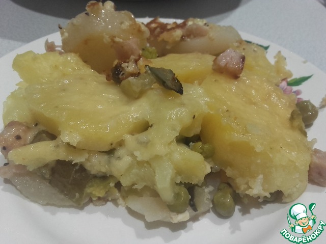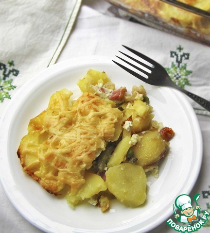Рецепт «Запечённый картофель с маринованными огурцами и горошком»: