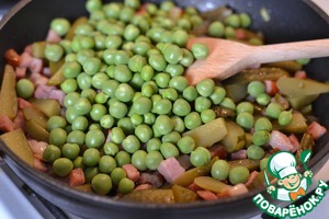 Добавим зеленый горошек. Перемешать и снять с огня.