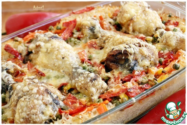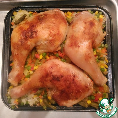 Для этого блюда я взяла длиннозерный рис Ориент от "Мистраль". Овощи у меня свежемороженные, но можно использовать и свежие, конечно. Куриные голени нужно посолить и добавить черный перец.
